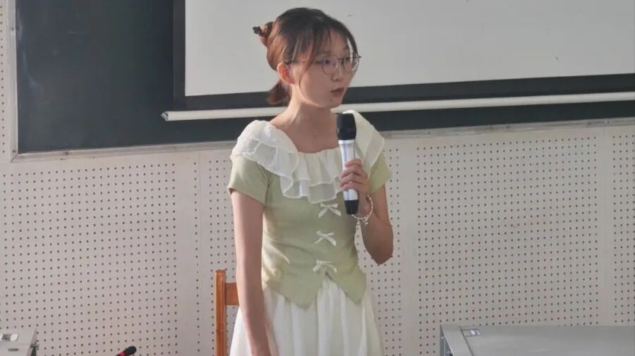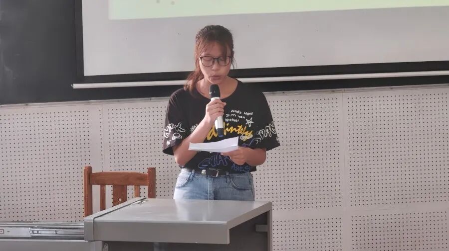 大会第一项,理学系义工队队长——刘丽君发言。她展示了义工队的辛勤付出,并获得多个荣誉,并且详细的说明了等级义工的评定准则,保证公平公正。鼓励每一个认真付出的义工。