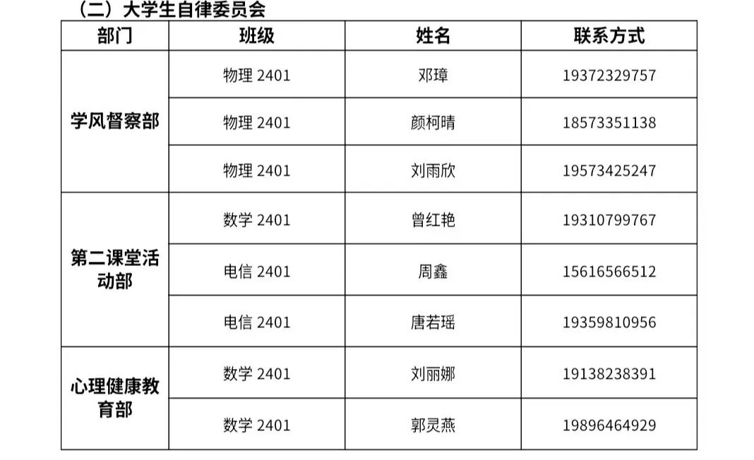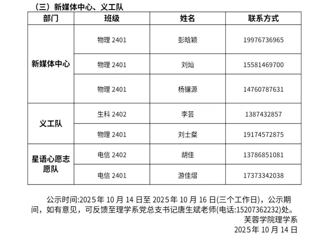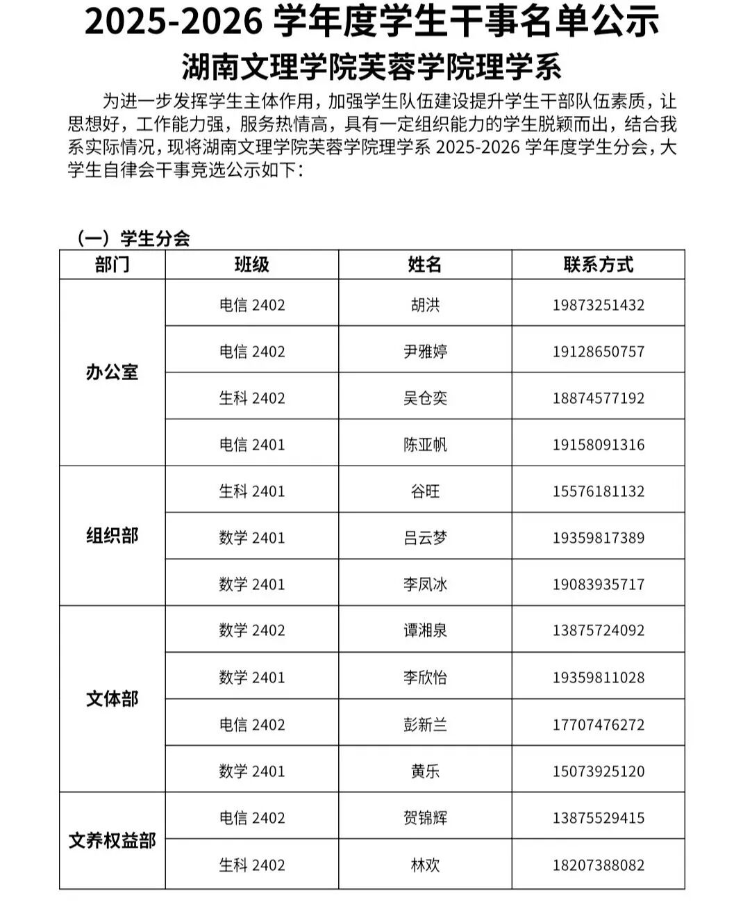 湖南文理学院芙蓉学院理学系学生会干事名单公示