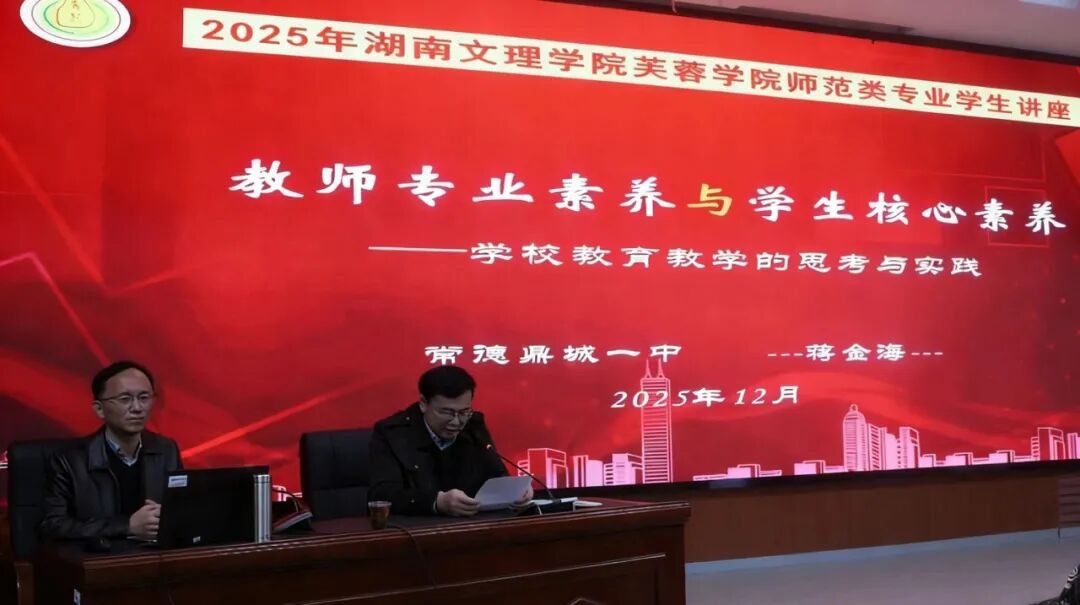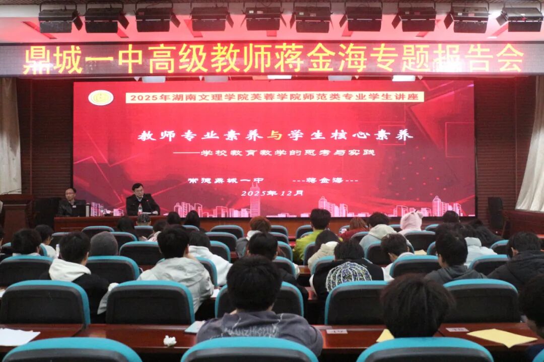 芙蓉学院于12月2日特邀鼎城第一中学党委书记蒋金海老师开展专题讲座,讲座由院长王兴柱教授主持。拥有27年高中物理教学经验与27年管理经验的蒋金海老师,以自身成长轨迹为蓝本,分享了教育教学的宝贵感悟。