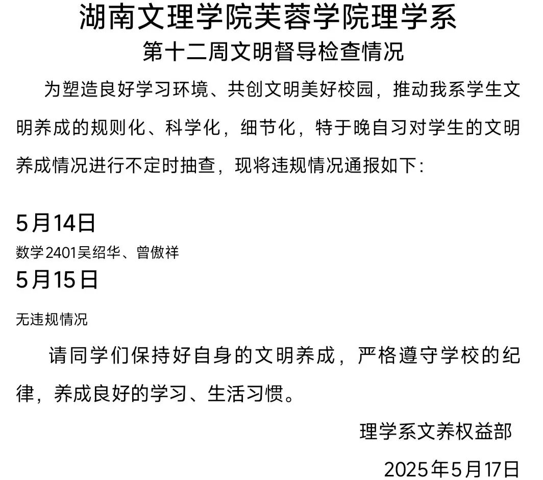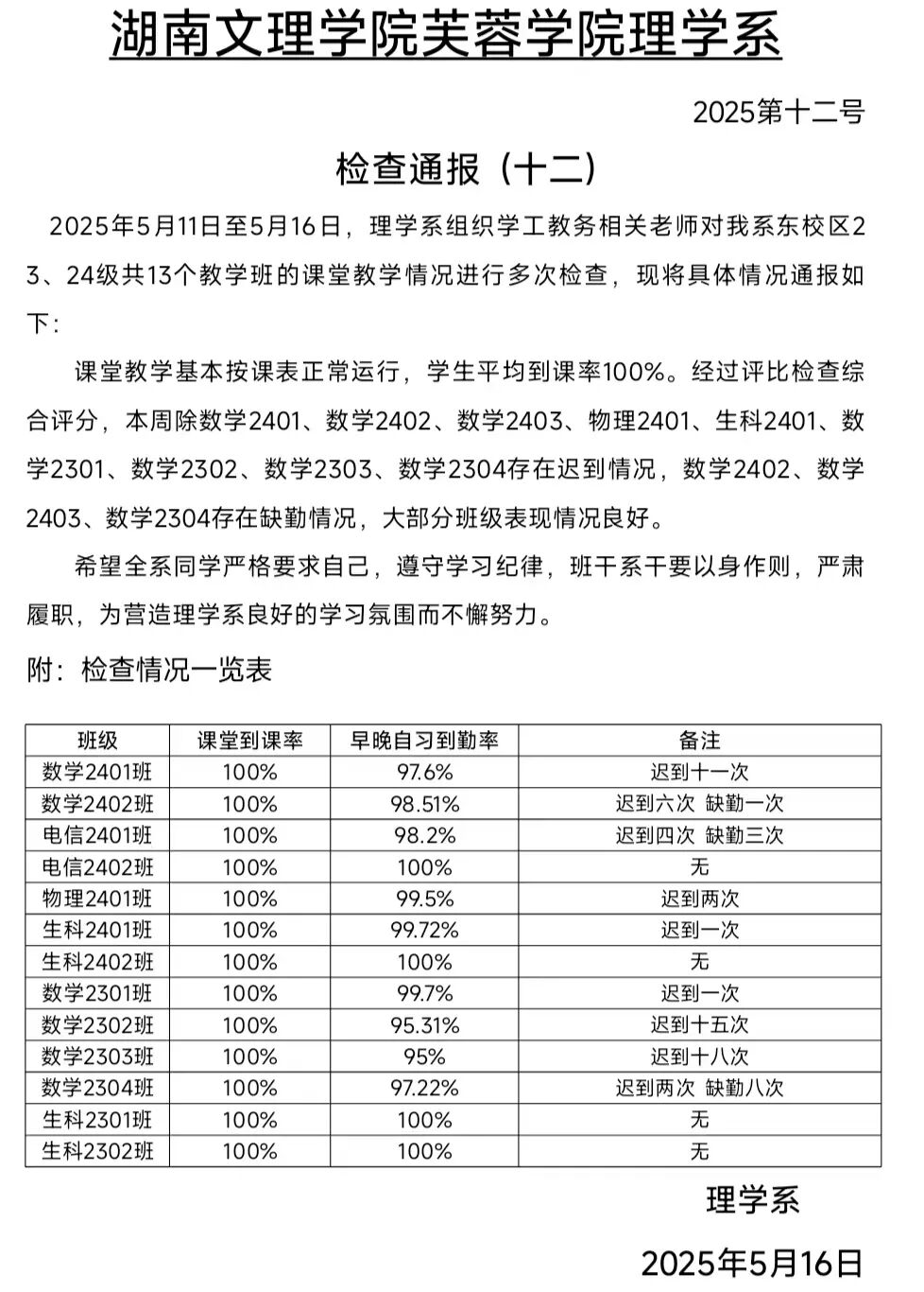 理学系2025年上半学年第十二周教学情况检查通报